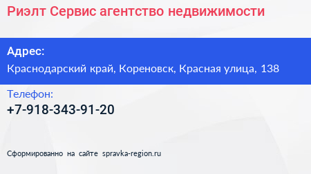 Риэлт-Сервис, агентство недвижимости по адресу Краснодарский край, Кореновск, Красная улица, 138 в дальнейшем Организация, размещена в следующих категориях: