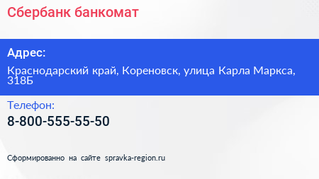 Сбербанк, банкомат по адресу Краснодарский край, Кореновск, улица Карла Маркса, 318Б в дальнейшем Организация, размещена в следующих категориях: