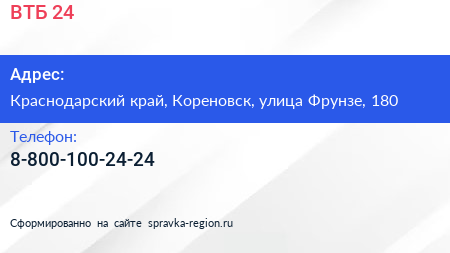 ВТБ 24 по адресу Краснодарский край, Кореновск, улица Фрунзе, 180 в дальнейшем Организация, размещена в следующих категориях: