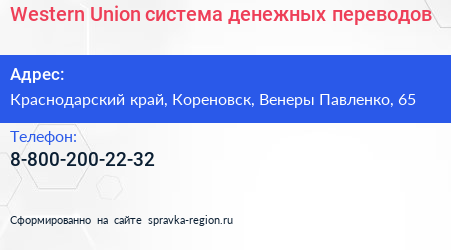 Western Union, система денежных переводов по адресу Краснодарский край, Кореновск, Венеры Павленко, 65 в дальнейшем Организация, размещена в следующих категориях: