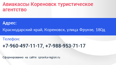 Авиакассы Кореновск, туристическое агентство по адресу Краснодарский край, Кореновск, улица Фрунзе, 180д в дальнейшем Организация, размещена в следующих категориях: