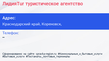 ЛидияTur, туристическое агентство по адресу Краснодарский край, Кореновск, в дальнейшем Организация, размещена в следующих категориях: