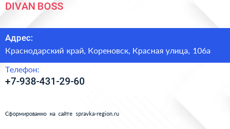 DIVAN BOSS по адресу Краснодарский край, Кореновск, Красная улица, 106а в дальнейшем Организация, размещена в следующих категориях: