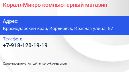 КораллМикро, компьютерный магазин по адресу Краснодарский край, Кореновск, Красная улица, 87 в дальнейшем Организация, размещена в следующих категориях: