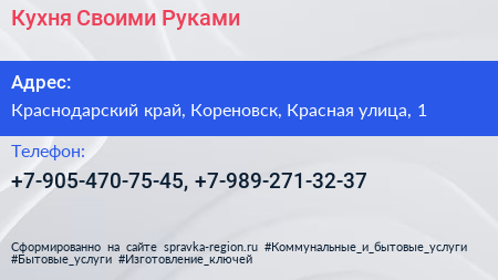 Кухня Своими Руками по адресу Краснодарский край, Кореновск, Красная улица, 1 в дальнейшем Организация, размещена в следующих категориях: