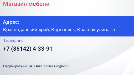 Магазин мебели по адресу Краснодарский край, Кореновск, Красная улица, 5 в дальнейшем Организация, размещена в следующих категориях: