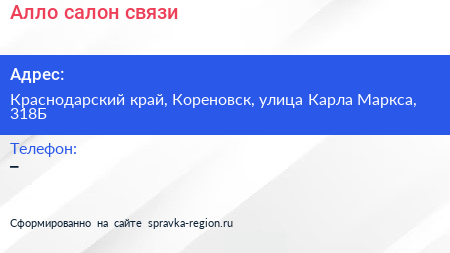 Алло, салон связи по адресу Краснодарский край, Кореновск, улица Карла Маркса, 318Б в дальнейшем Организация, размещена в следующих категориях: