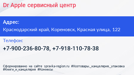 Dr. Apple, сервисный центр по адресу Краснодарский край, Кореновск, Красная улица, 122 в дальнейшем Организация, размещена в следующих категориях: