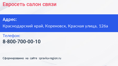 Евросеть, салон связи по адресу Краснодарский край, Кореновск, Красная улица, 126а в дальнейшем Организация, размещена в следующих категориях: