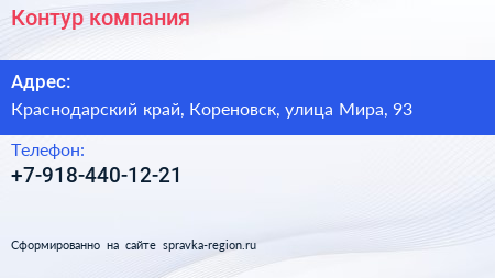 Контур, компания по адресу Краснодарский край, Кореновск, улица Мира, 93 в дальнейшем Организация, размещена в следующих категориях: