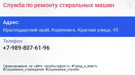 Служба по ремонту стиральных машин по адресу Краснодарский край, Кореновск, Красная улица, 45 в дальнейшем Организация, размещена в следующих категориях: