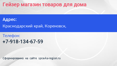 Гейзер, магазин товаров для дома по адресу Краснодарский край, Кореновск, в дальнейшем Организация, размещена в следующих категориях: