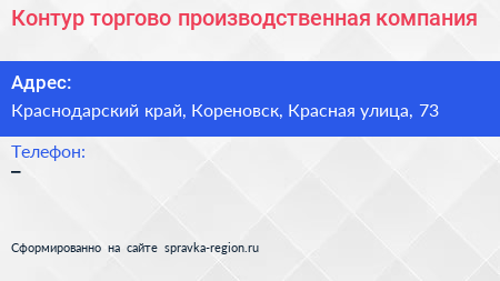 Контур, торгово-производственная компания по адресу Краснодарский край, Кореновск, Красная улица, 73 в дальнейшем Организация, размещена в следующих категориях: