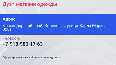 Дуэт, магазин одежды по адресу Краснодарский край, Кореновск, улица Карла Маркса, 318в в дальнейшем Организация, размещена в следующих категориях: