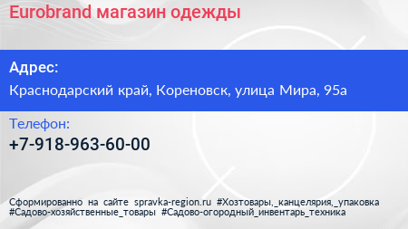 Eurobrand, магазин одежды по адресу Краснодарский край, Кореновск, улица Мира, 95а в дальнейшем Организация, размещена в следующих категориях: