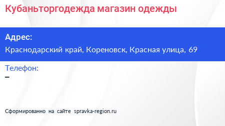 Кубаньторгодежда, магазин одежды по адресу Краснодарский край, Кореновск, Красная улица, 69 в дальнейшем Организация, размещена в следующих категориях: