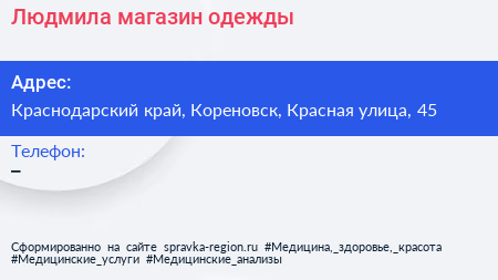 Людмила, магазин одежды по адресу Краснодарский край, Кореновск, Красная улица, 45 в дальнейшем Организация, размещена в следующих категориях: