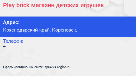 Play-brick, магазин детских игрушек по адресу Краснодарский край, Кореновск, в дальнейшем Организация, размещена в следующих категориях: