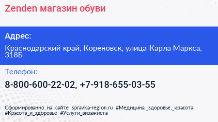 Zenden, магазин обуви по адресу Краснодарский край, Кореновск, улица Карла Маркса, 318Б в дальнейшем Организация, размещена в следующих категориях: