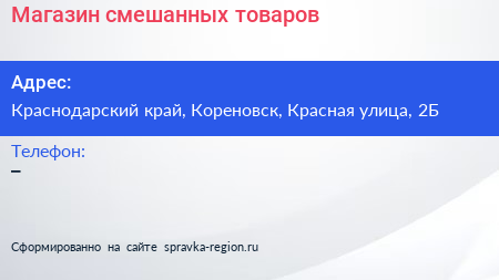 Магазин смешанных товаров по адресу Краснодарский край, Кореновск, Красная улица, 2Б в дальнейшем Организация, размещена в следующих категориях: