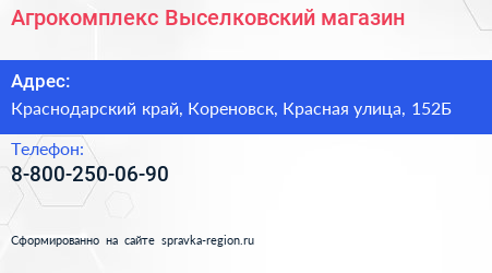 Агрокомплекс Выселковский, магазин по адресу Краснодарский край, Кореновск, Красная улица, 152Б в дальнейшем Организация, размещена в следующих категориях:
