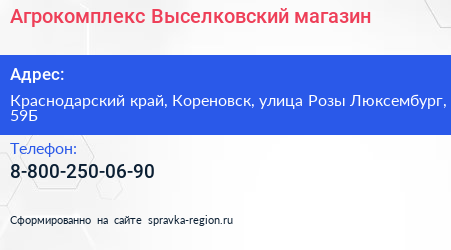 Агрокомплекс Выселковский, магазин по адресу Краснодарский край, Кореновск, улица Розы Люксембург, 59Б в дальнейшем Организация, размещена в следующих категориях: