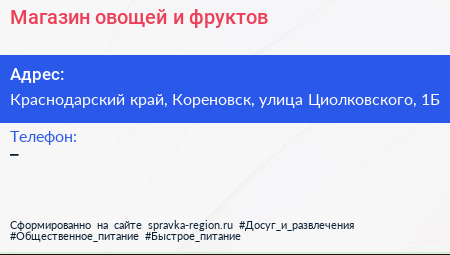 Магазин овощей и фруктов по адресу Краснодарский край, Кореновск, улица Циолковского, 1Б в дальнейшем Организация, размещена в следующих категориях: