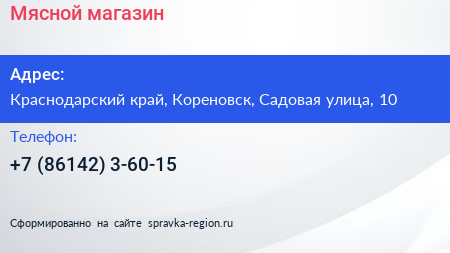 Мясной магазин по адресу Краснодарский край, Кореновск, Садовая улица, 10 в дальнейшем Организация, размещена в следующих категориях:
