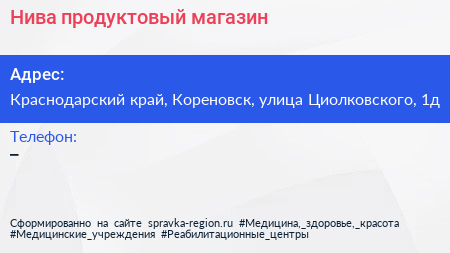 Нива, продуктовый магазин по адресу Краснодарский край, Кореновск, улица Циолковского, 1д в дальнейшем Организация, размещена в следующих категориях: