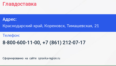 Главдоставка по адресу Краснодарский край, Кореновск, Тимашевская, 21 в дальнейшем Организация, размещена в следующих категориях: