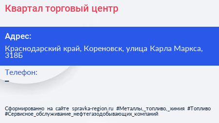 Квартал, торговый центр по адресу Краснодарский край, Кореновск, улица Карла Маркса, 318Б в дальнейшем Организация, размещена в следующих категориях: