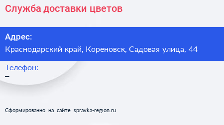 Служба доставки цветов по адресу Краснодарский край, Кореновск, Садовая улица, 44 в дальнейшем Организация, размещена в следующих категориях:
