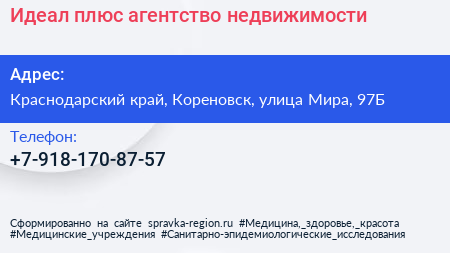 Идеал плюс, агентство недвижимости по адресу Краснодарский край, Кореновск, улица Мира, 97Б в дальнейшем Организация, размещена в следующих категориях: