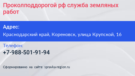 Проколподдорогой.рф, служба земляных работ по адресу Краснодарский край, Кореновск, улица Крупской, 16 в дальнейшем Организация, размещена в следующих категориях: