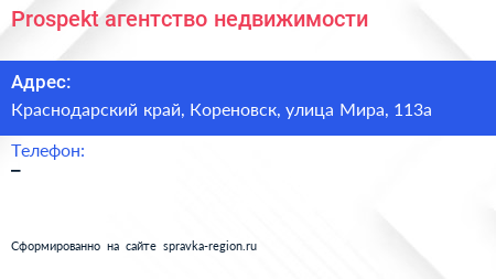 Prospekt, агентство недвижимости по адресу Краснодарский край, Кореновск, улица Мира, 113а в дальнейшем Организация, размещена в следующих категориях: