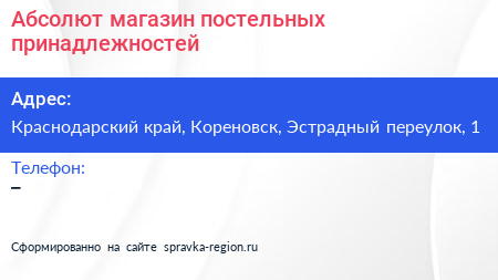 Абсолют, магазин постельных принадлежностей по адресу Краснодарский край, Кореновск, Эстрадный переулок, 1 в дальнейшем Организация, размещена в следующих категориях: