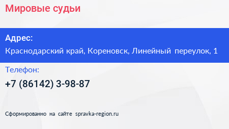 Мировые судьи по адресу Краснодарский край, Кореновск, Линейный переулок, 1 в дальнейшем Организация, размещена в следующих категориях: