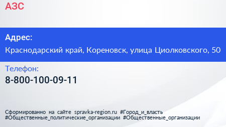 АЗС по адресу Краснодарский край, Кореновск, улица Циолковского, 50 в дальнейшем Организация, размещена в следующих категориях: