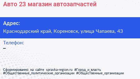 Авто 23, магазин автозапчастей по адресу Краснодарский край, Кореновск, улица Чапаева, 43 в дальнейшем Организация, размещена в следующих категориях: