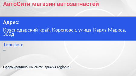АвтоСити, магазин автозапчастей по адресу Краснодарский край, Кореновск, улица Карла Маркса, 365д в дальнейшем Организация, размещена в следующих категориях: