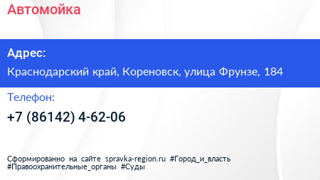 Автомойка по адресу Краснодарский край, Кореновск, улица Фрунзе, 184 в дальнейшем Организация, размещена в следующих категориях: