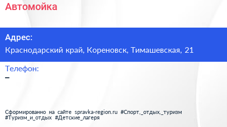 Автомойка по адресу Краснодарский край, Кореновск, Тимашевская, 21 в дальнейшем Организация, размещена в следующих категориях:
