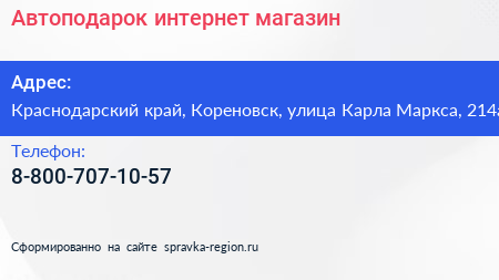 Автоподарок, интернет-магазин по адресу Краснодарский край, Кореновск, улица Карла Маркса, 214а в дальнейшем Организация, размещена в следующих категориях: