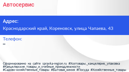 Автосервис по адресу Краснодарский край, Кореновск, улица Чапаева, 43 в дальнейшем Организация, размещена в следующих категориях: