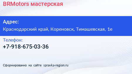 BRMotors, мастерская по адресу Краснодарский край, Кореновск, Тимашевская, 1е в дальнейшем Организация, размещена в следующих категориях: