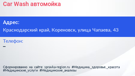 Car Wash, автомойка по адресу Краснодарский край, Кореновск, улица Чапаева, 43 в дальнейшем Организация, размещена в следующих категориях: