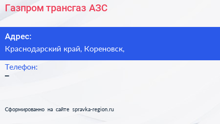 Газпром трансгаз, АЗС по адресу Краснодарский край, Кореновск, в дальнейшем Организация, размещена в следующих категориях: