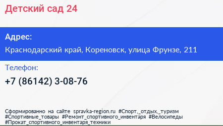 Детский сад №24 по адресу Краснодарский край, Кореновск, улица Фрунзе, 211 в дальнейшем Организация, размещена в следующих категориях: