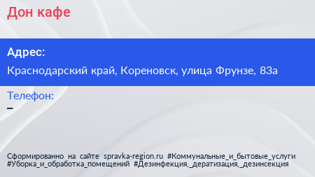 Дон, кафе по адресу Краснодарский край, Кореновск, улица Фрунзе, 83а в дальнейшем Организация, размещена в следующих категориях: