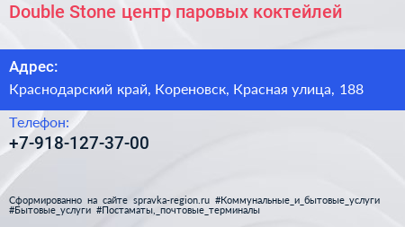 Double Stone, центр паровых коктейлей по адресу Краснодарский край, Кореновск, Красная улица, 188 в дальнейшем Организация, размещена в следующих категориях: